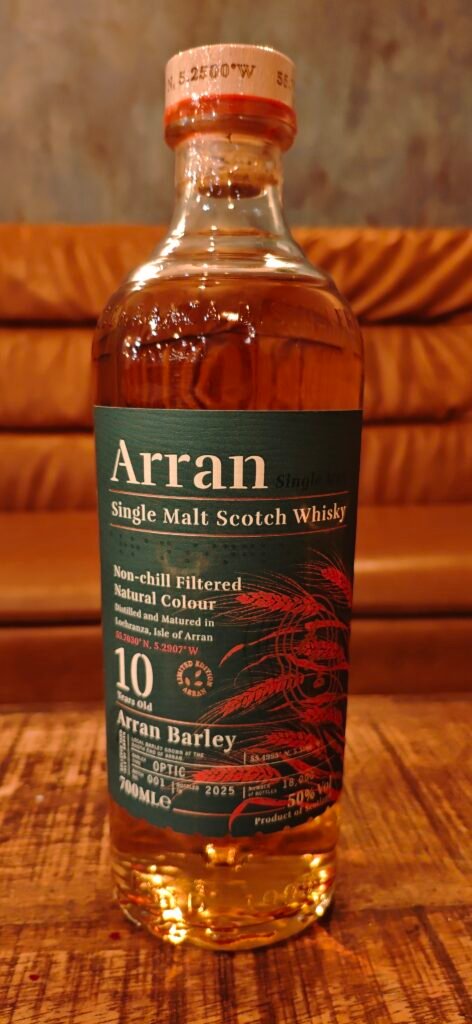 Arran single malt whisky (from the Lochranza distillery on the Isle of Arran) is mostly made using the Concerto variety of barley. This bottle, however, is the first in a series of releases that will use different varieties and explore different cask maturations. For this first entry, they’ve used Optic barley from a local Arran farm and aged the spirit in a mix of bourbon and sherry barrels similar to their standard 10 year old.