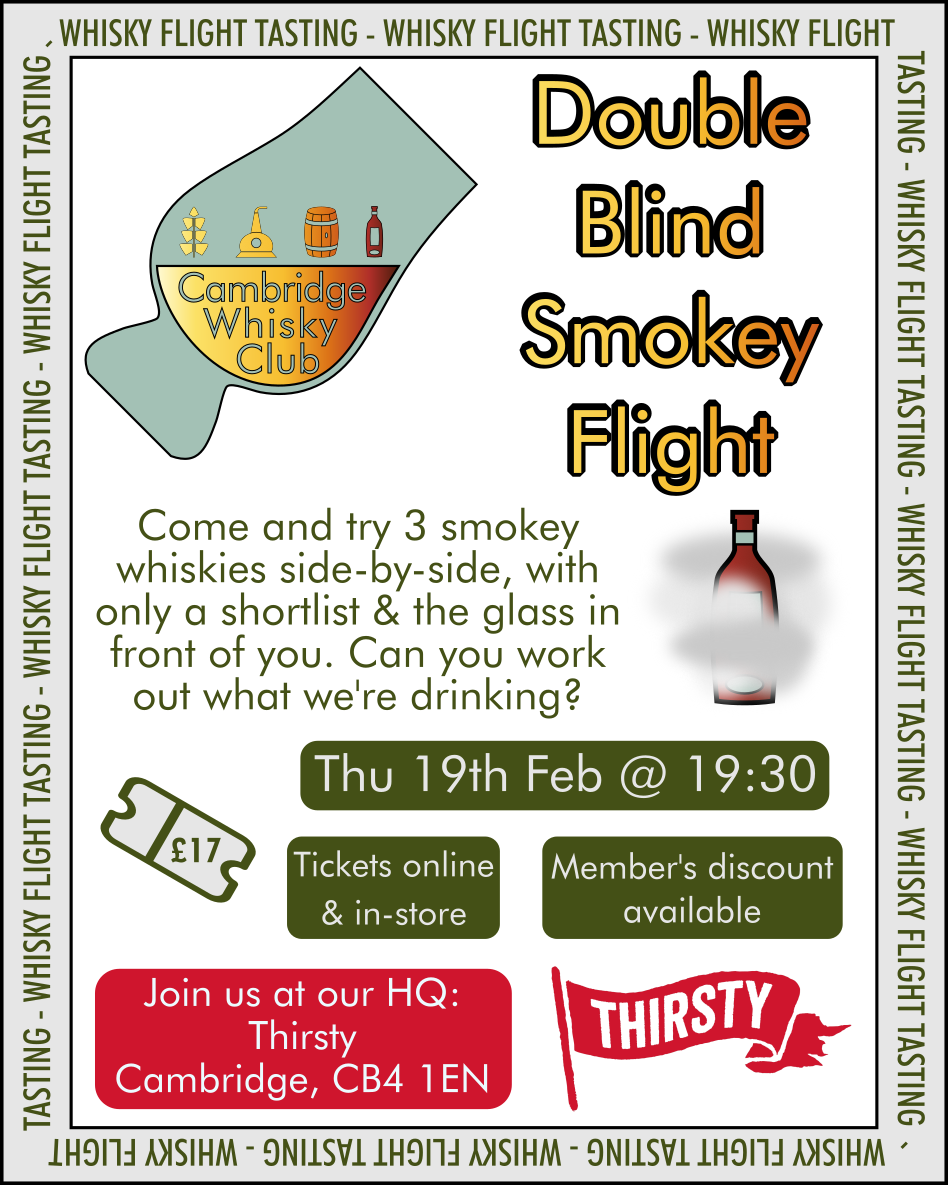 Pretty easy to introduce this one: just before Christmas, we did a double blind flight tasting with full measures of 3 non-smokey whiskies side by side, and it was a hit – this time it’s the same again but with smokey whiskies. I’ll submit 3 shortlists to the team at Thirsty (one per flight slot), and they’ll pick which 3 whiskies we get. In the room, on the night, I’ll make sure we have access to that shortlist, but otherwise we’ll only have the whiskies in the glass and our own formative experiences to go on, until the grand reveal at the end.