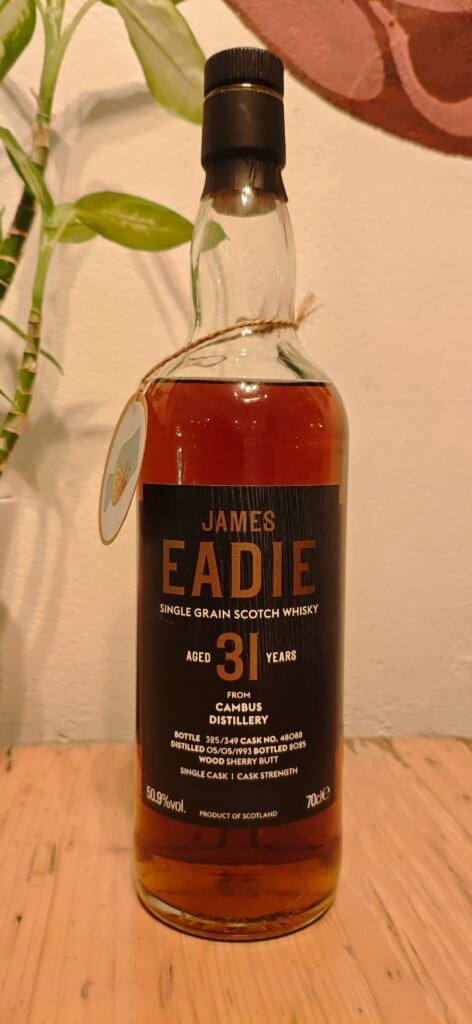 Cambus is a lost distillery, meaning it is no longer active and producing spirit – only the last sleeping casks remain, steadily going up in price as they become rarer. One of those casks was a sherry butt, of undisclosed style, which had been maturing since May 1993. It was cracked open earlier this year (2025) by independent bottler James Eadie, and this bottle is one of the 349 that were released from it. So this is unadulterated, sherried Cambus, no extra finish, just well-aged mature single grain whisky.