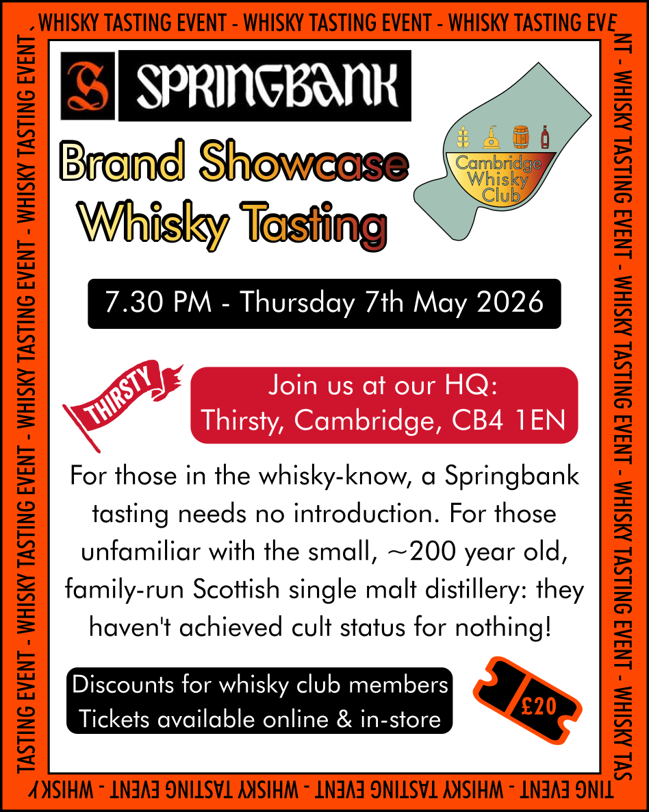 As the artwork says, for many of you, this tasting won’t need an introduction. I expect it’ll be one of our fastest sellers. Andrew is going to be presenting 7 bottles across their Hazelburn (unpeated), Springbank (lightly peated) and Longrow (heavily peated) ranges, including some special bottles that you won’t see on many shelves outside of collectors’ homes at this point.